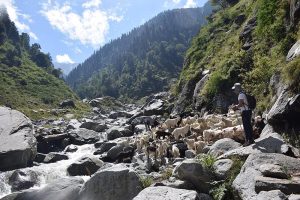 This pass is of exceptional beauty and one can behold from here both sides of the Kangra and the Ravi valleys. After about four hours of climbing down one reaches Marhu, which flat land and a camping ground.