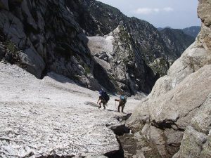 Three hours of steady and stiff climbing over snowy and steep rocks takes one to minkiani pass. The route is clear in the beginning and ascends gradually but become steep half way up to the pass. This provides a very scenic view of both Kangra and Chamba/Pangi valley and offers distant view of the Middle and Greater Himalayas. The route to the other side of the pass is clear and easy but very steep.